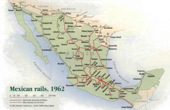 Before getting started into this section, I feel a short discussion of the geography of Mexico with regards to population dispersal would be in order. On the map of Mexico, draw a line from Veracruz on the gulf coast west through Puebla to Mexico City. From there continue the line west to Guadalajara. Now shade an area approximately 50 miles wide to the south of this line and 100 miles wide to the north of it. Within this shaded area lives about 70% of Mexico’s population and over 80% of all industrial development. With this understanding, it is easy to visualize all major rail traffic in Mexico either fed into this belt or radiated outward and north to the United States.