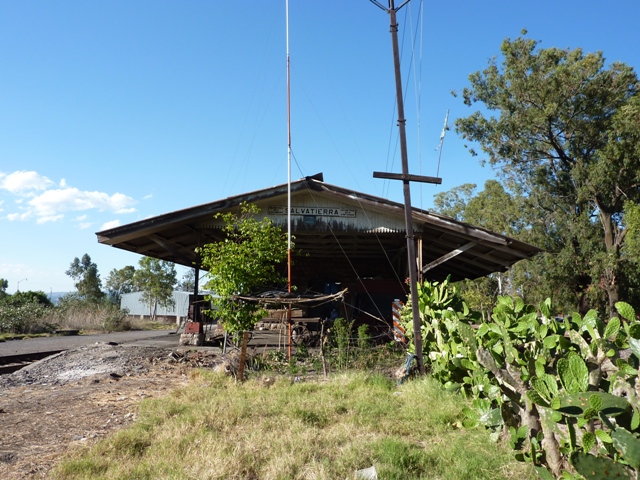 Línea NB, Kilómetro: 29 Distrito de: Ubicación Geográfica: Camino a San Felipe s/n. Salvatierra, Guanajuato. (Ver en mapa) Estado Actual: Techos estructuralmente muy mal. Oficinas sin uso. Bodegas ya sin techo. Fotografía: Roberto Ruelas-Gómez Fecha: 13 abril 2010