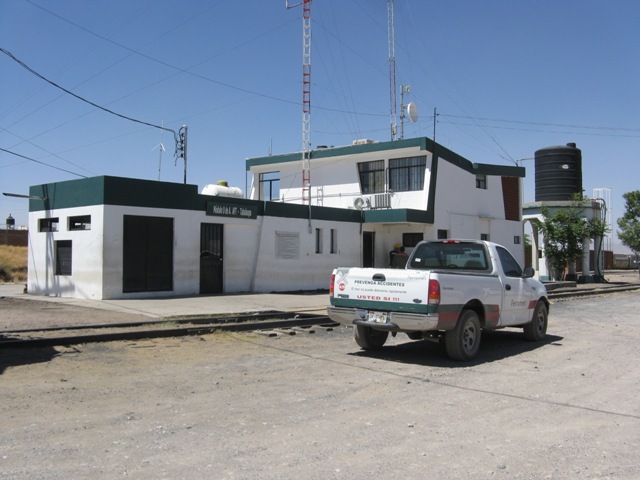 Línea Q, Kilómetro: 381 Distrito de: Ubicación Geográfica: Tabaloapa, Chihuahua, Chihuahua. (Ver en mapa) Estado Actual: Oficinas de Ferromex Fotografía: Juan Cabuto Vidrio Cortesía de la FUNDACIÓN FERROCARRILES DE BAJA CALIFORNIA, I. A. P. Fecha: 2011 111120 Roberto Ruelas Gómez Regresa a ESTACIONES DE FERROCARRIL