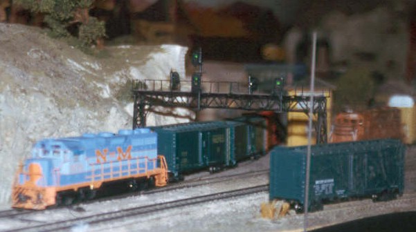 The same NdeM GP35 and train pass under Dan's home-built signal bridge. The light vertical line to the right is the edge of an acrylic shield that protects the signal bridge from accidental damage.